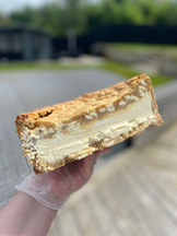 White chocolate chip vanilla cookie crust filled with white chocolate spread and white chocolate bars.